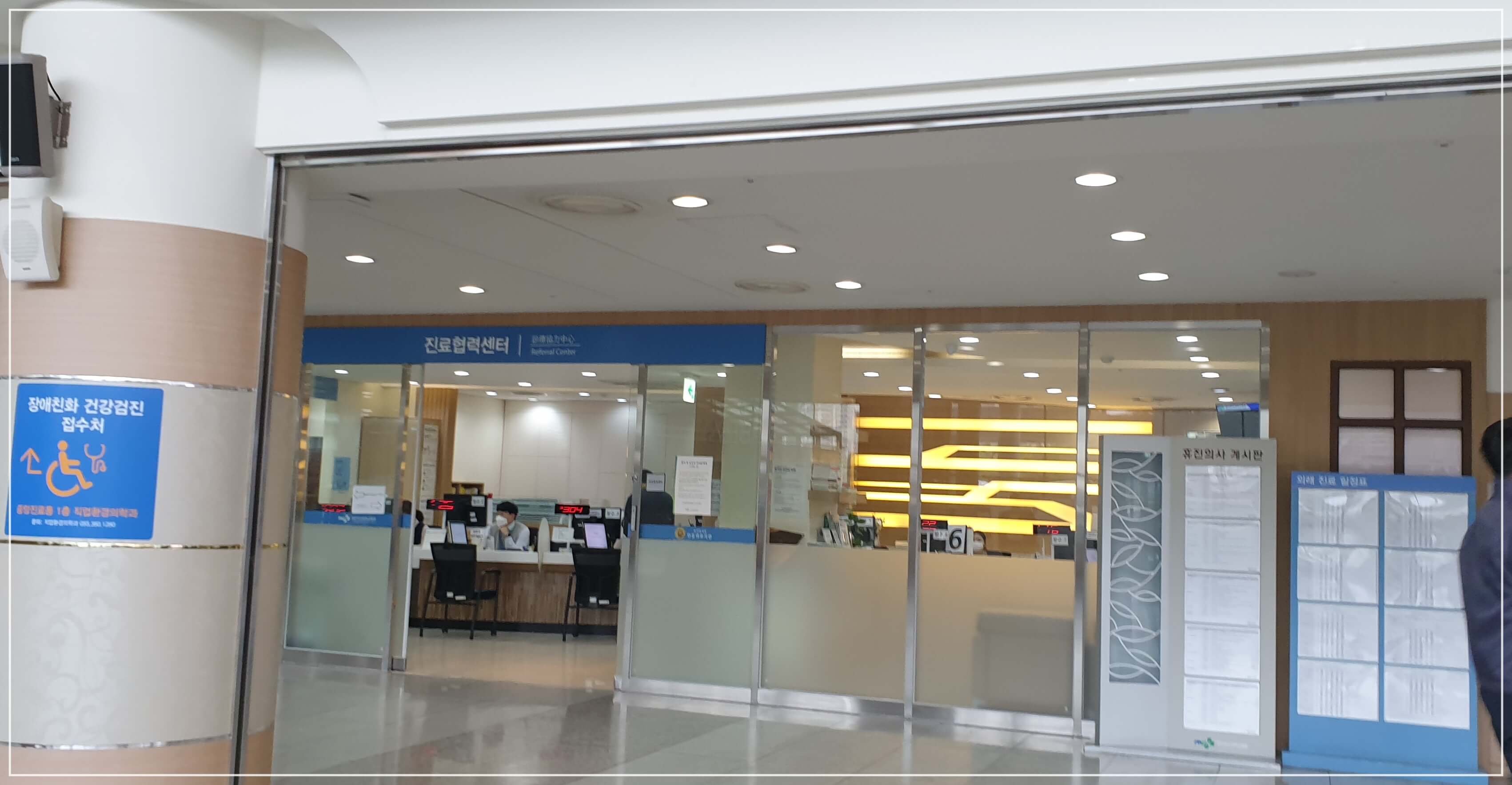 먼저 본관 1층에 들어가면 정면에 보이는 원무과 왼쪽으로 진료협력센터가 있는데 처음 방문한 사람들은 이쪽으로 가면 된다.