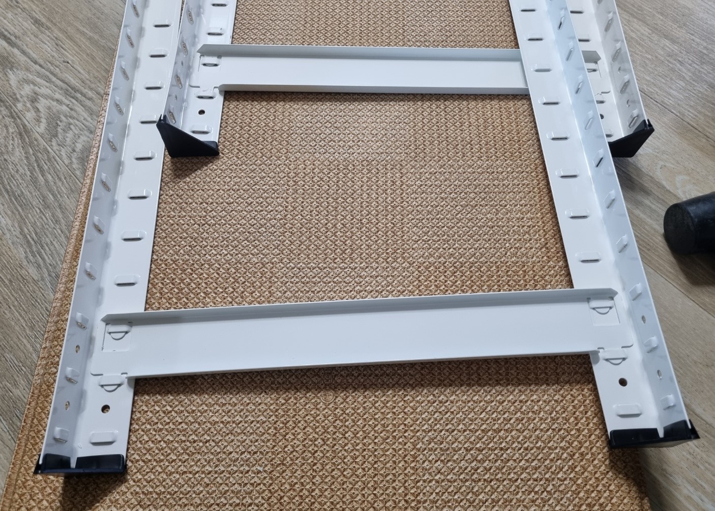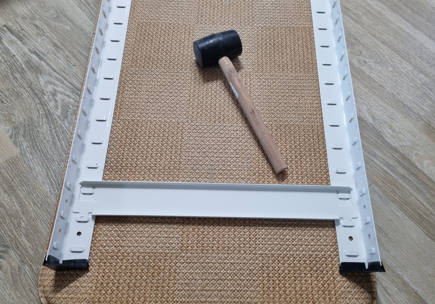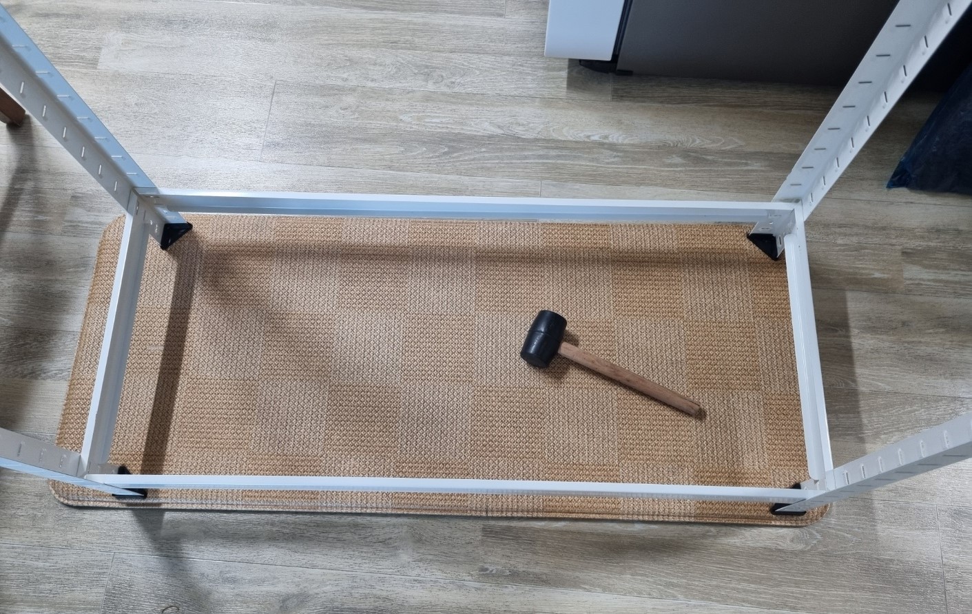 이제 각 기둥을 연결 하는데 이 때에는 손으로 하기 힘들기 때문에 집에 있던 고무 망치를 이용했다. 이 제품에는 고무 망치는 들어있지 않지만 전에 다른 선반을 살 때 들어 있던 고무 망치를 활용했다. 각 홈에 맞춰서 고무 망치로 몇번씩만 탕탕 해주면 쉽게 들어 간다. 이렇게 4개의 기둥을 연결하면 이 위에 나무 판을 올리면 선반이 만들어 진다.