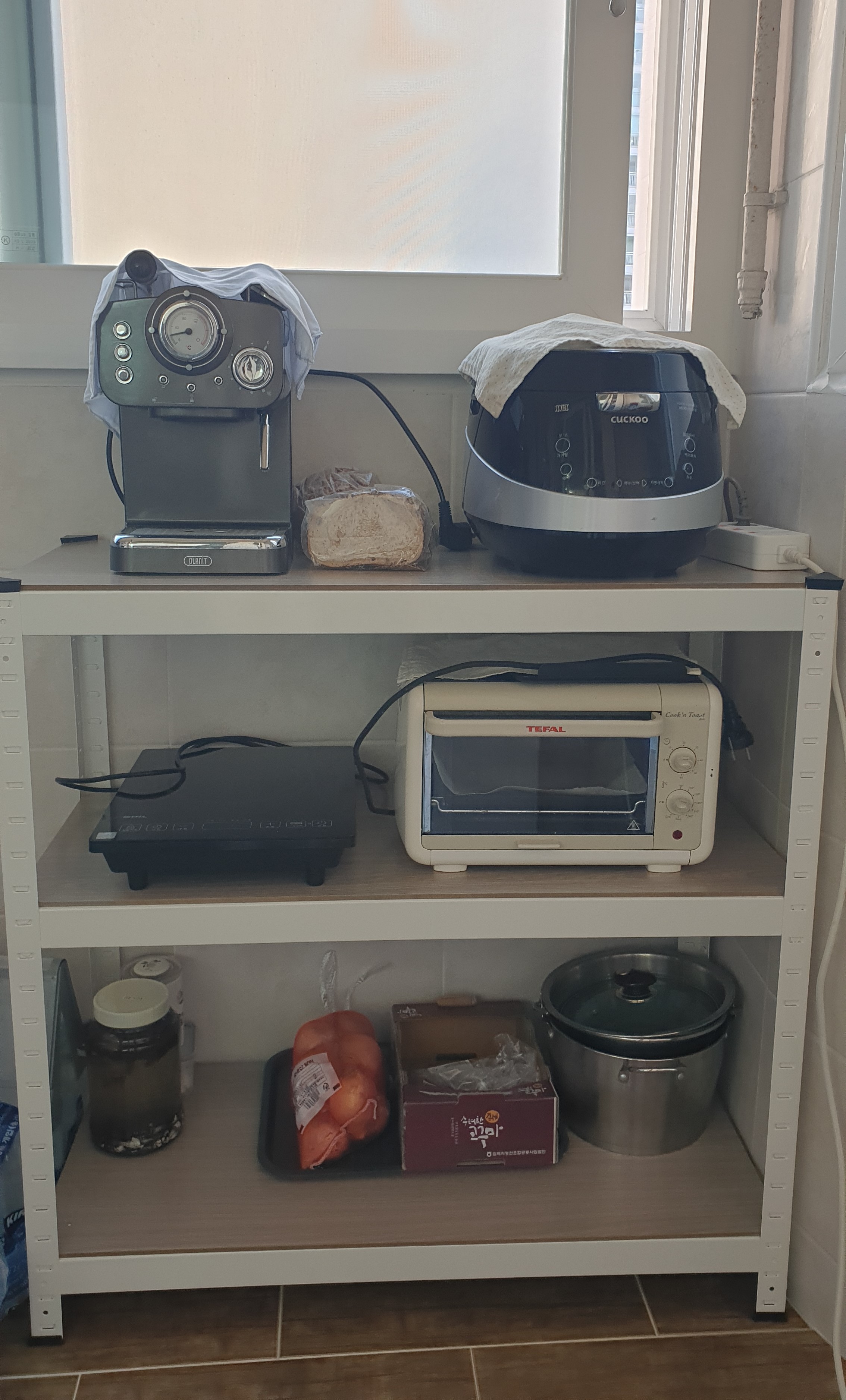 주방 옆에 있는 베란다라서 그런지 조금만 관리를 소홀히 하면 벽에 결로 현상이 생기고 곰팡이가 생기기 때문에 깔끔하고 예쁜 장들이 많이 있지만 우리 집은 뒤가 막히지 않은 선반으로 결정했다.