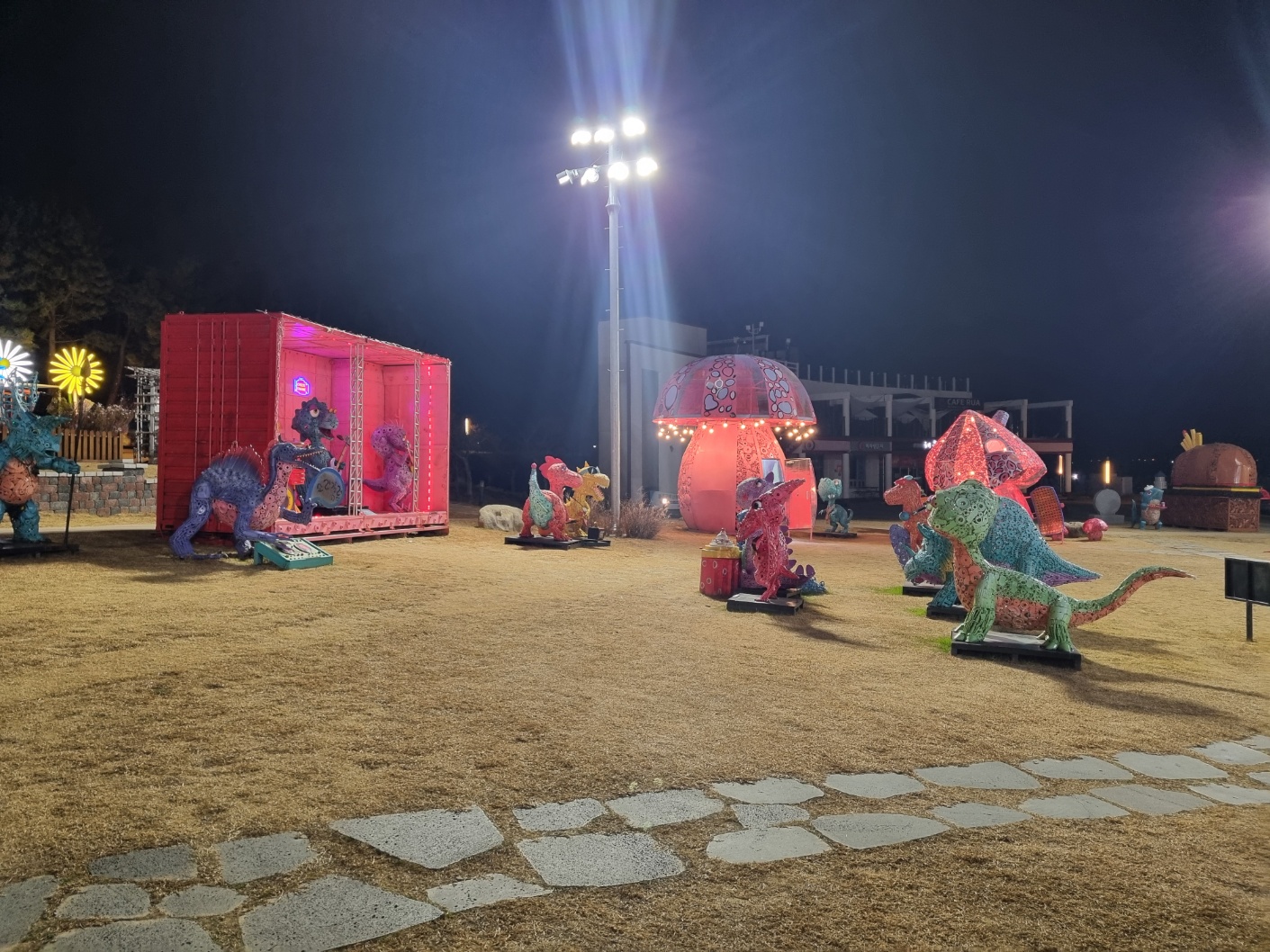 콘서트 하는 공룡들과 관객들. 스머프 마을에서나 있을 법한 버섯 집.