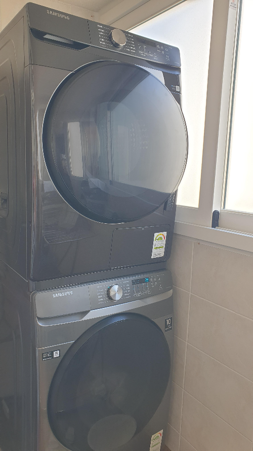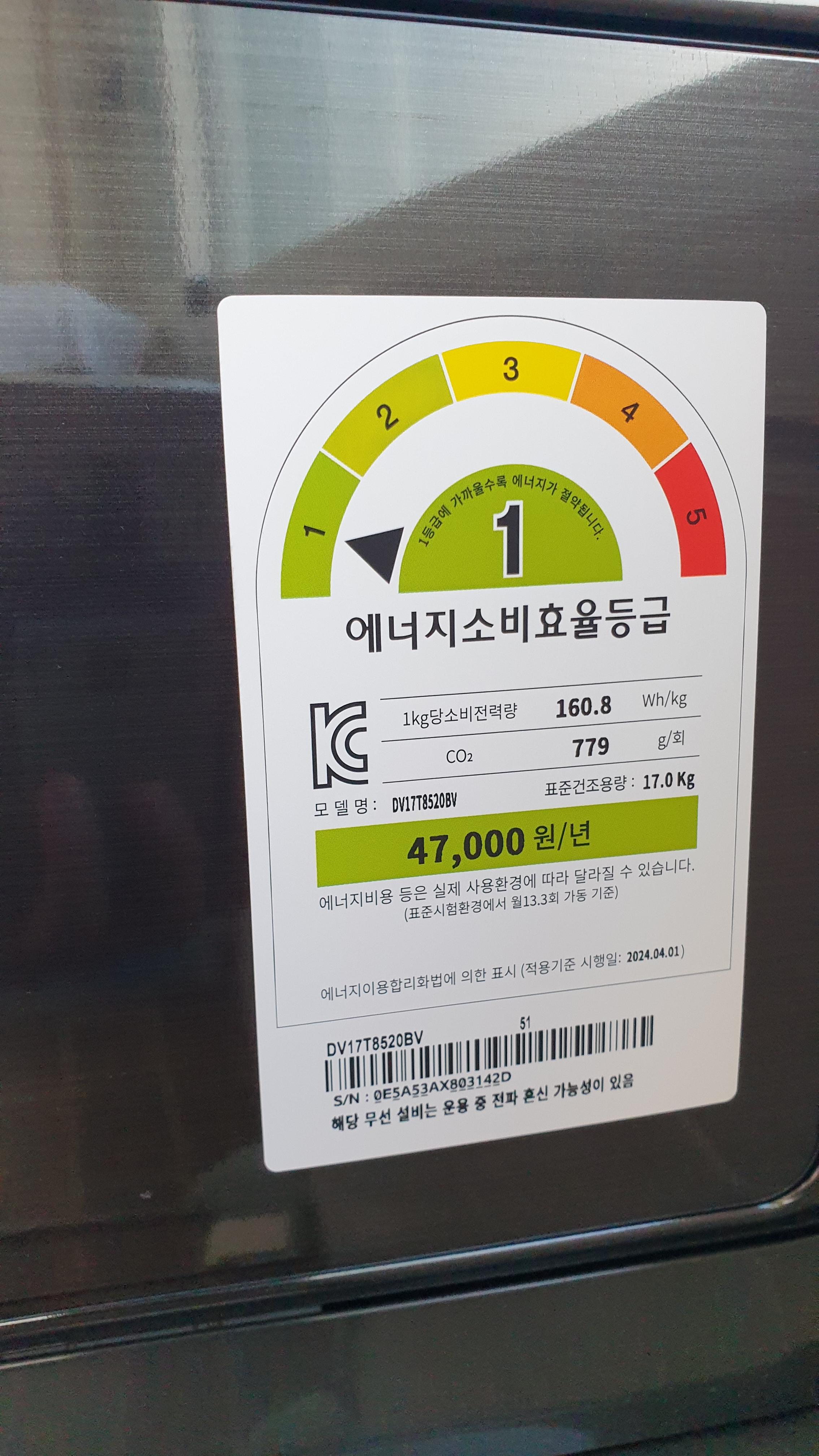 내가 기존에 사용하고 있던 세탁기는 WF19 T6000 KP라는 제품이고 새로 구입한 건조기는 DV17T 8520BV라는 제품이다. 모델명 마지막이 P인 세탁기는 이녹스실버? 그레이 색이고, 모델명 마지막이 V로 끝나는 건조기는 블랙캐비어로 더 어두운 색이다.