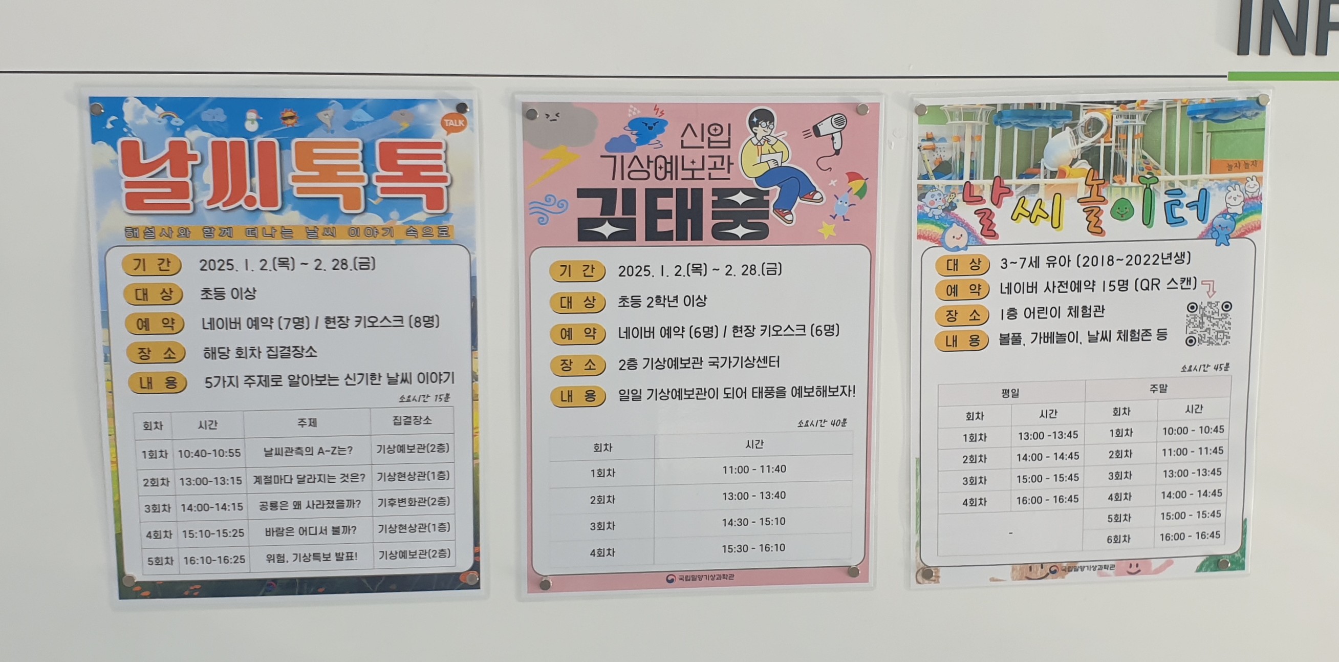 ※ 시작 후 5분 경과(미입장) 시 자유관람으로 대체됩니다. ※ 반드시 매표소에서 과학관 입장권을 발권해 주시기 바랍니다. [ 날씨톡톡 프로그램 ] - 운영기간 : 상시운영 - 소요시간 : 회차별 15