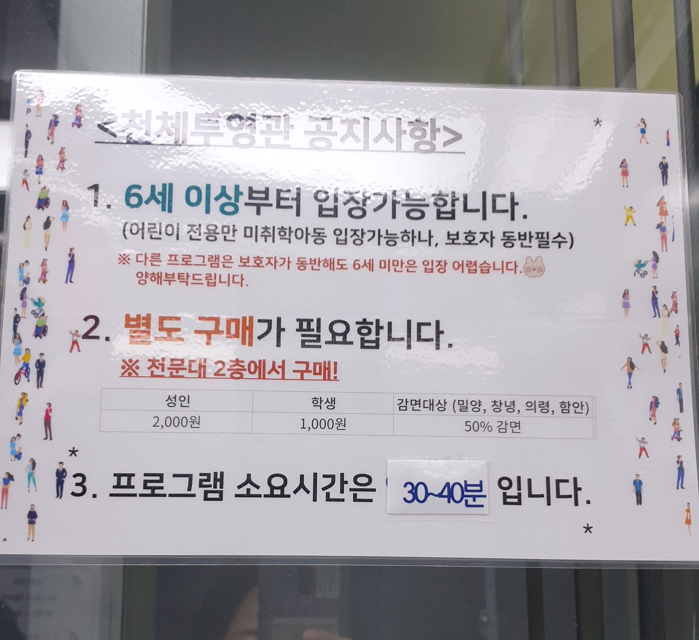 밀양성인(과학관) 1000원 밀양학생(과학관) 500원
