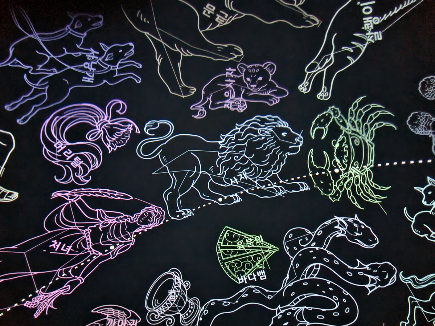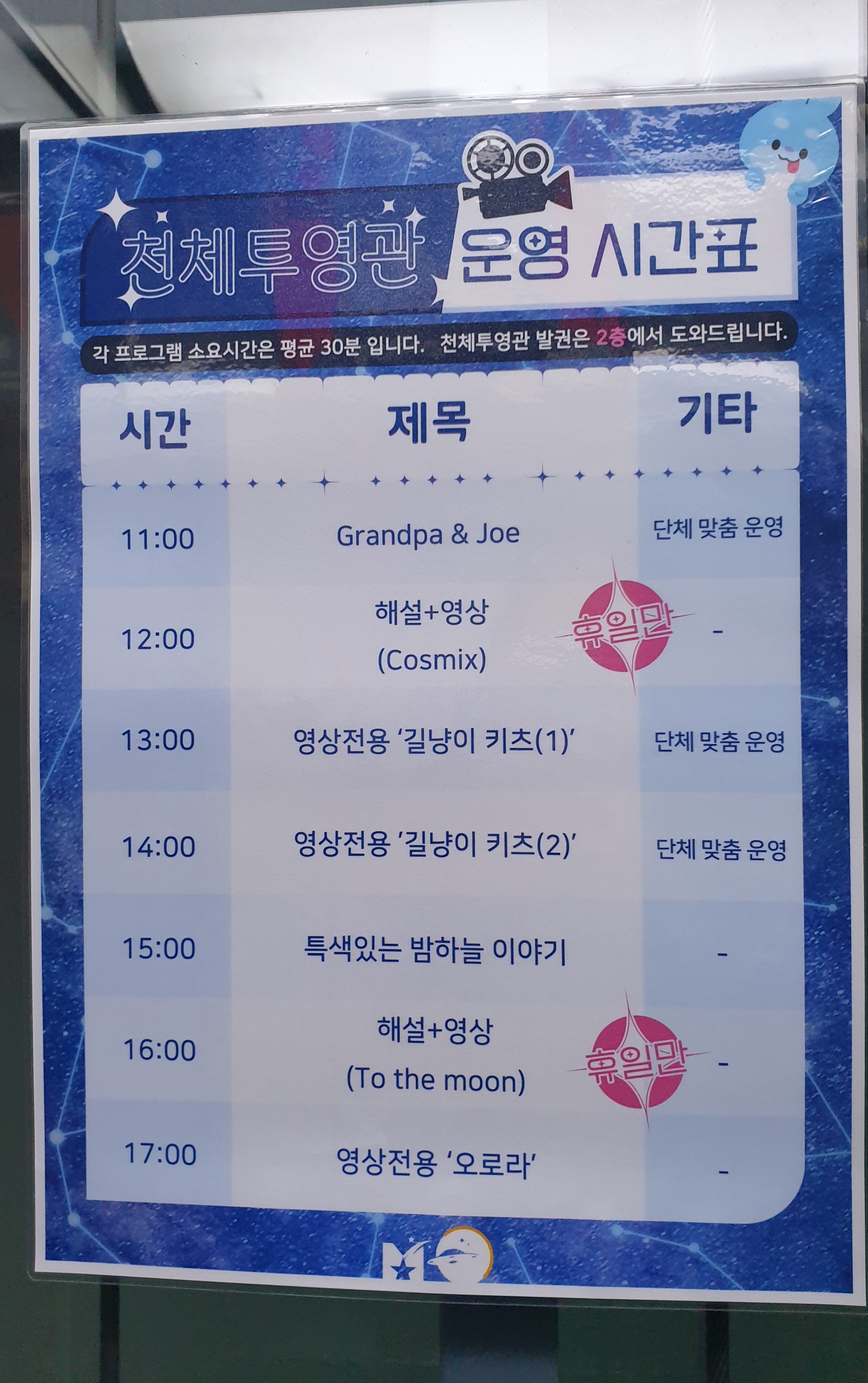 다른 시간에는 아이들이 좋아하는 만화영화 같은 걸 틀어주신다고 했는데 우리가 갔던 시간은 '특색있는 밤하늘 이야기'라고 별자리 이야기를 해주셨다. 솔직히 그냥 영화를 틀어주었다면 커다란 돔 천장에 영상을 보는구나 하고 말았을 텐데 깜깜한 밤하늘에 반짝이는 별을 보고 있으니 너무 좋았다. 별을 보면서 별자리에 얽힌 이야기도 들려주시고 밤하늘에서 방향을 찾는 방법도 알려주셨다. 30분 정도 시간이었는데 짧게 느껴질 정도로 너무 좋은 시간이었다.