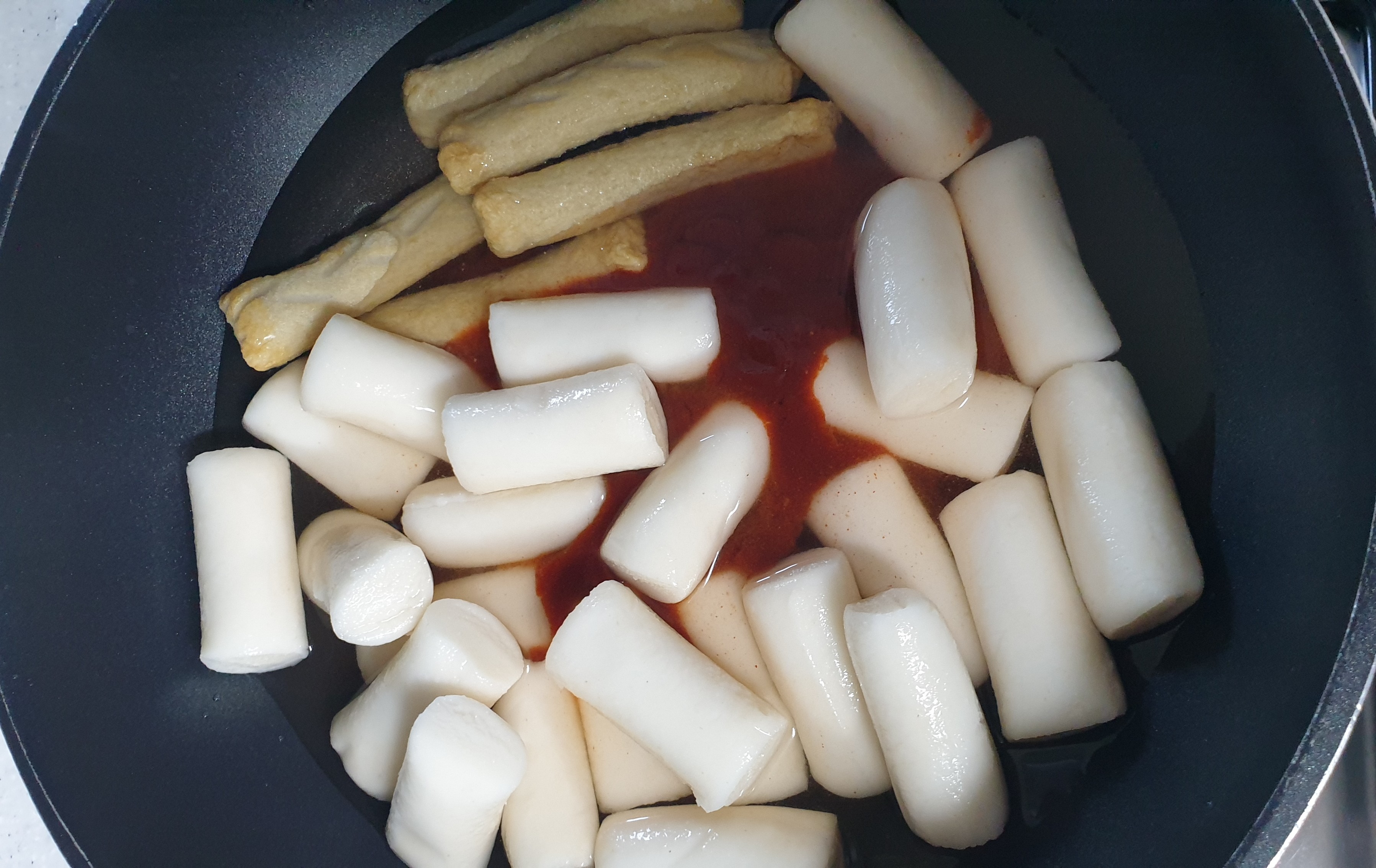2. 냄비에 물 170cc 와 떡, 소스를 넣고 강불에서 조리를 시작한다.