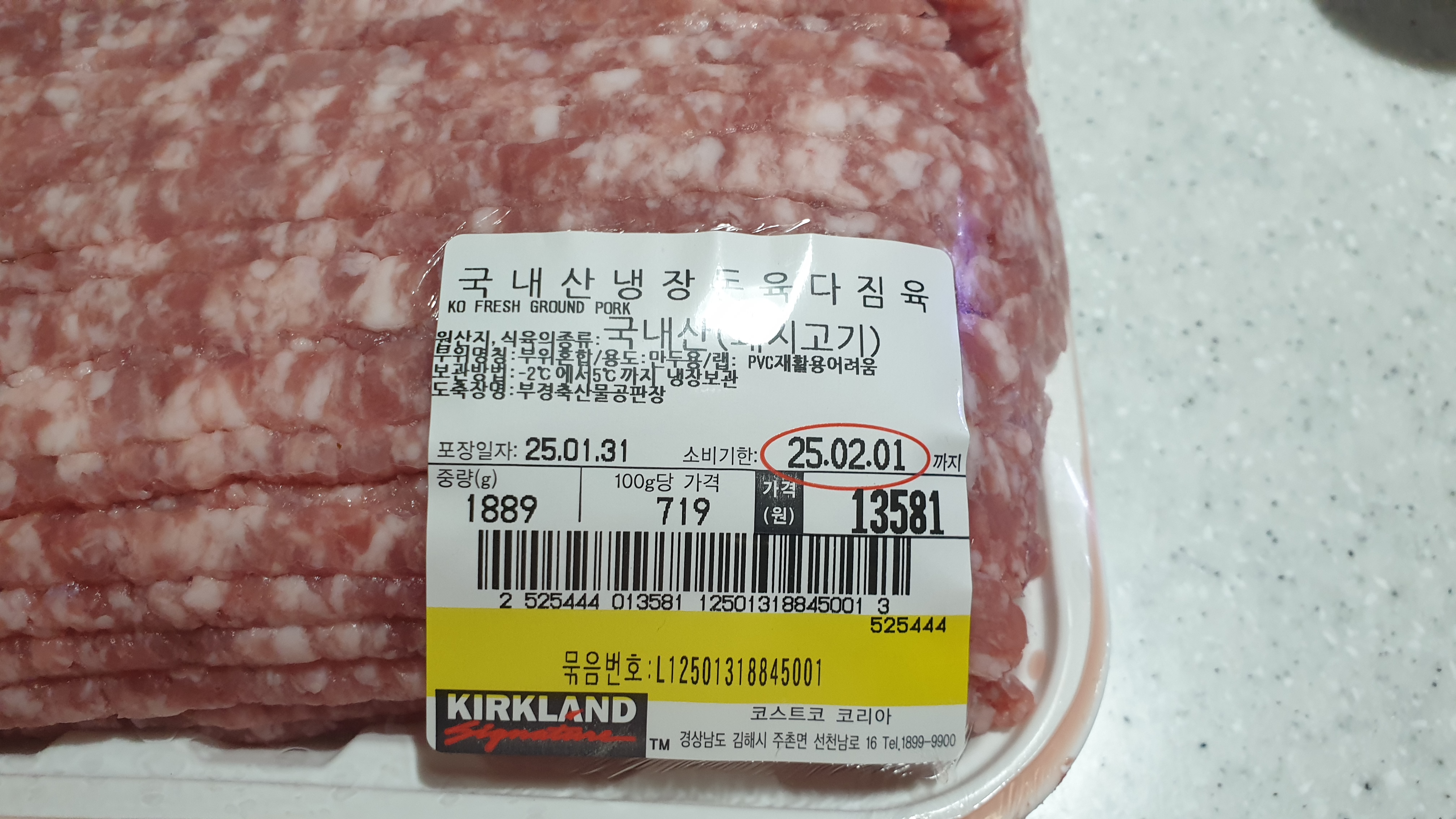 국산 돈육 다짐육 1889g 13581원( 100g당 719원)