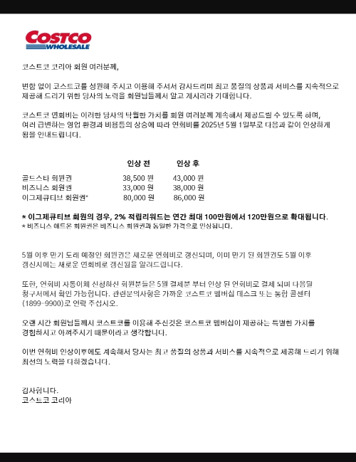 요즘 경기도 힘들고 물가는 계속 올라가는데 코스트코 연회비까지 인상된다는 문자를 받았다.