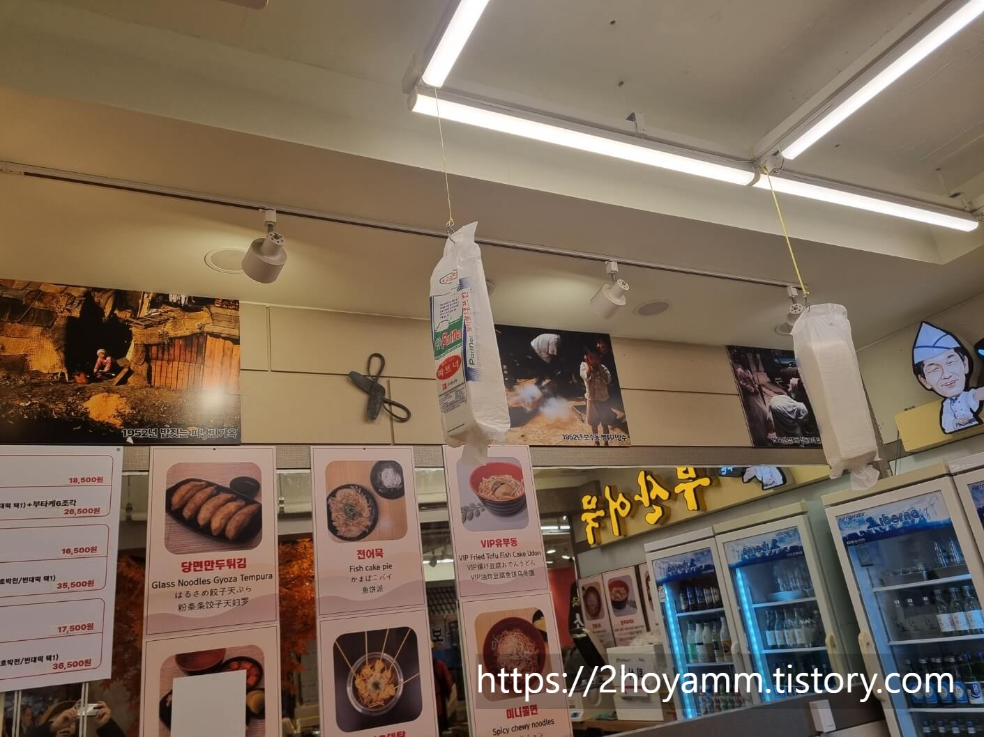 벽에 옛날 깡통시장 사진과 옛날 물건들이 장식되어 있었다. 음식을 기다리는 동안 주위를 둘러보며 구경하는 것도 재밌었다. 한참을 찾았던 냅킨도 천장에 잘 달려 있었다. 테이블이 좁으니 좋은 아이디어다.