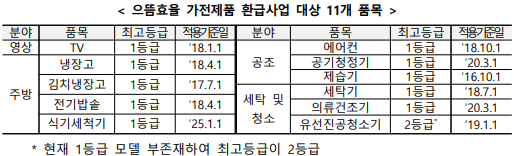 에너지 소비효율 1등급 제품을 구매하면, 일정 금액(최대 30만 원까지)을 현금으로 돌려 받을 수 있는 환급 제도다. 냉장고, 세탁기, 에어컨 등 일상에서 많이 사용하는 가전제품 11개가 대상이다.