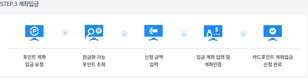 결과를 확인했으면 이제 계좌 입금을 하겠습니다. 포인트를 계좌에 입금을 요청하는데 현금화 가능 포인트를 조회하여 신청 금액을 입력합니다. 그리고 입금 계좌를 입력하고 계좌인증을 진행합니다. 이렇게 하면 카드포인트 계좌입금 신청이 완료되는데 직접 해보니 신청이 완료되고 곧바로 계좌에 입금이 됩니다.