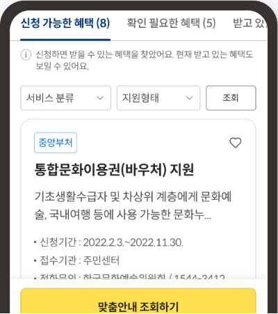 4. 맞춤안내 조회가 완료되면 받을 수 있는 보조금, 이미 받고 있는 보조금 정보를 확인하고 보조금 24에서 바로 신청할 수 있습니다.