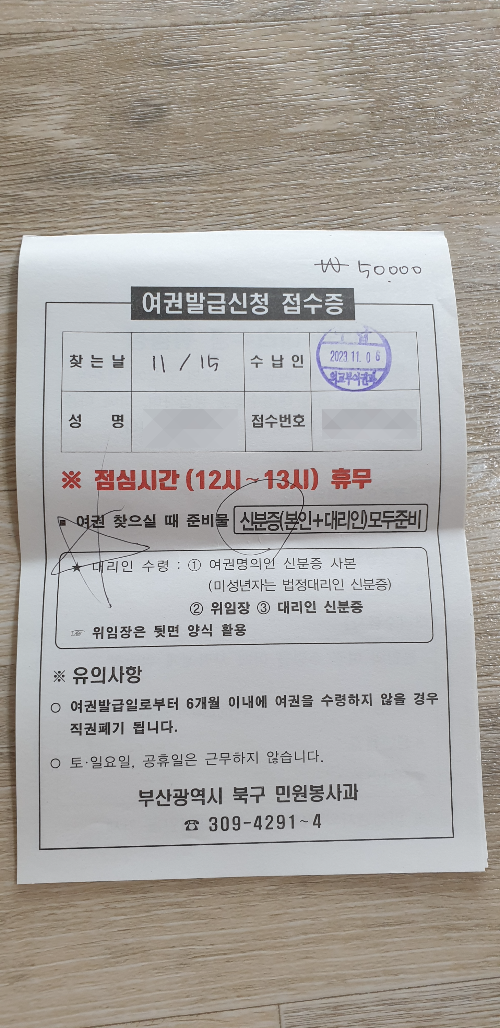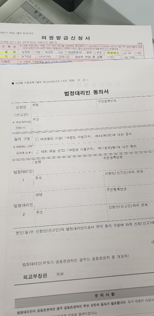 집에서 가까운 부산 북구청으로 방문하여 여권을 신청하였습니다. 본관 1층에서 여권발급신청서와 아이들은 법정대리인 동의서까지 작성하고 신분증과 함께 제출하면 됩니다. 아이들 여권 신청시 서명란에는 보호자의 서명을 하도록 합니다.