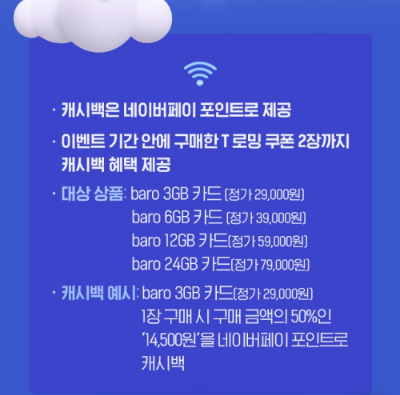 캐시백은 네이버페이 포인트로 제공되고 이벤트 기간 안에 구매한 T 로밍 쿠폰 2장까지 캐시백 혜택을 제공합니다.