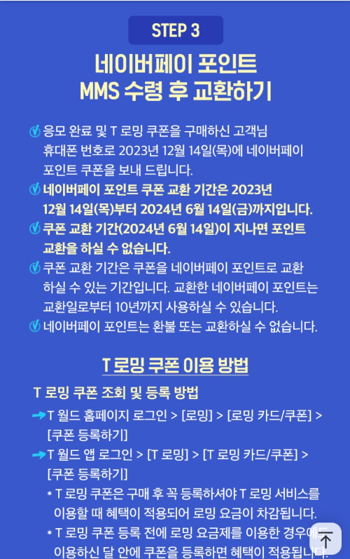 응모 완료 및 T 로밍 쿠폰을 구매한 번호로 2023년 12월 14일 (목)에 네이버페이 포인트 쿠폰을 보내 드립니다.