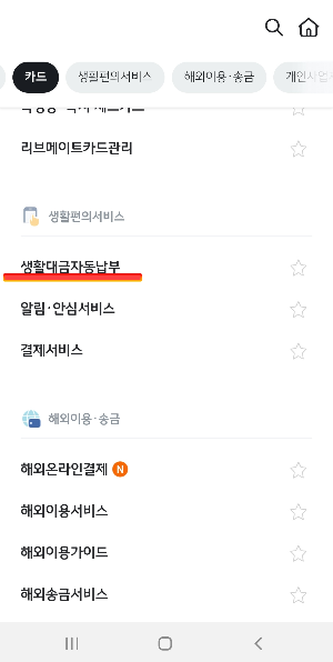 카드 사진이 보이는 첫 화면에서 오른쪽 위에 있는 세줄을 눌러 목록으로 들어갑니다. 여러 가지 목록을 확인할 수 있는데 아래쪽으로 쭉 내리다 보면 생활편의서비스에 있는 생활대금자동납부를 찾을 수 있습니다. 여기 생활대금 자동납부가 관리비, 도시가스 등등 자동이체를 신청할 수 있는 곳입니다.