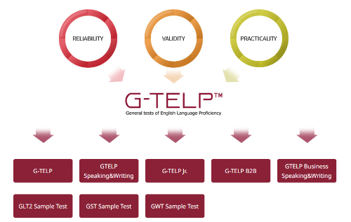 일반적인 시험 구성은 pater-based test (PBT)로 문법/독해/청취를 평가하는 G-TESP Level Test(GLT),말하기 시험인 G-TELP Spteaking Test(GST), 작문시험인 G-TELP Writing Test(GWT)로 구성되어 있습니다. 기업의 비즈니스 영역 평가에 특화된 말하기와 작문시험인 G-TELP Business Test(GBST/GBWT), 주니어 종합 영어평가시험인 G-TELP Jr. 가 있습니다. 특수 목적형 시험인 UN.ICAO 규정 항공영어말하기 자격시험인 English proficiency Test for Aviation(EPTA)가 있습니다.