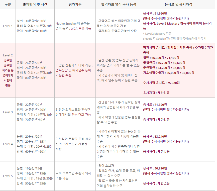 LEVEL에 따라 시험이 달라지니 자기에게 맞는 레베을 찾아 접수하시기 바랍니다.