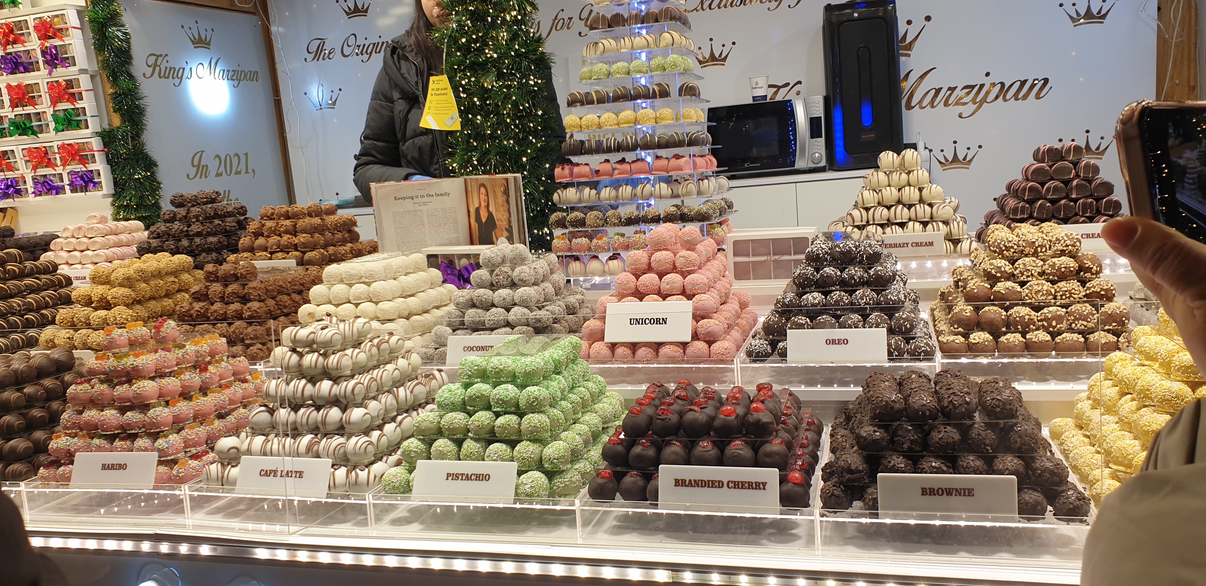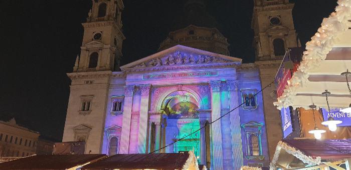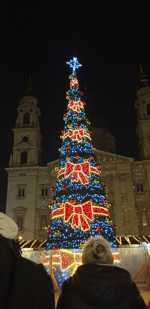 밥을 먹고 나와 크리스마스 마켓을 가기로 하고 성이슈트반 대성당 마켓으로 향했습니다. 한국에서도 밤에는 거의 돌아다니지 않기에 아이들의 눈이 반짝반짝~~. 맛은 없겠지만 맛있길 바라며 아이들도 기분은 내야 하기에 사탕하나씩 사 들고 여기저기 구경하면서 성 이슈트반 대성당에 도착하니 멋진 트리와 함께 성당에도 화려한 조명으로 크리스마스 분위기를 물씬 내고 있었습니다. 그동안 코로나로 인해 크리스마스 장식도 마켓도 작은 규모로 했었는데 올해는 좀 더 크고 화려하다고 합니다. 그래도 비엔나나 프라하 보다는 작다고 하는데 다른 나라 크리스마스 마켓도 궁금했습니다. 월요일 밤인데도 사람들이 제법 있었지만 주말에 비해 많이 않아서 사진도 찍고 아이들과 구경하기에 괜찮았습니다.
