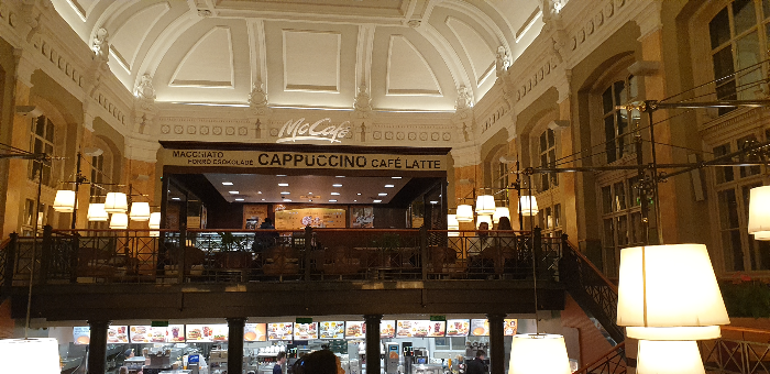 아침 7시 30분경 기차가 출발하기 때문에 조금 더 서둘러 6시쯤 기차역에 도착했습니다. 우리는 기차역 바로 옆에 있는 맥도널드에서 아침을 먹기로하고 맥도날드에 갔습니다. 큰 아이가 부다페스트 여행을 준비하면서 알아본 꼭 가보고 싶은 맥도날드가 바로 여기여서 너무 좋았습니다. 이 맥도날드는 세계에서 가장 아름다운 곳이라고 합니다. 일부러 찾아간 것은 아니지만 이렇게 갈 수 있어서 좋았습니다. 입구에 들어서자마자 이곳이 왜 세계에서 가장 아름다운 맥도날드인지 한번에 이해가 됐습니다. 우리가 아는 그런 패스트푸드 매장이 아닌 성에 들어온 것처럼 웅장하고 멋졌습니다. 원래 이곳에 어느 백작의 성이었다는 이야기도 들었습니다. 이른 아침이라서 사람들이 많은 것은 아니었지만 자리가 넓고 2층까지 있어서 불편함 없이 이용할 수 있었습니다. 1층에서 버거 종류를 주문 하고 2층에 맥카페가 있어서 커피나 케익 종류를 주문할 수 있었습니다. 맥도날드에서 친절을 잘 느끼지 못하지만 여기서는 주문을 받는 직원도 웃으며 친절하게 응대해 줘서 아침 일찍부터 기분이 좋았습니다.